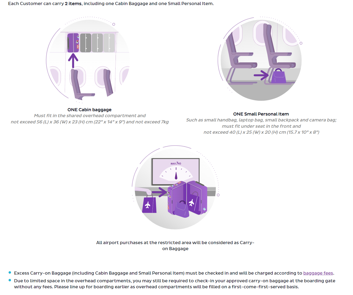 *Excess Cabin Baggage and Small Personal Item must be checked in. All Gate Baggage must be within Checked Baggage size and weigh no more than 32kg. Remaining checked baggage allowance cannot be used to offset baggage fee. Retrieval of checked baggage at the boarding gate will not be accommodated.