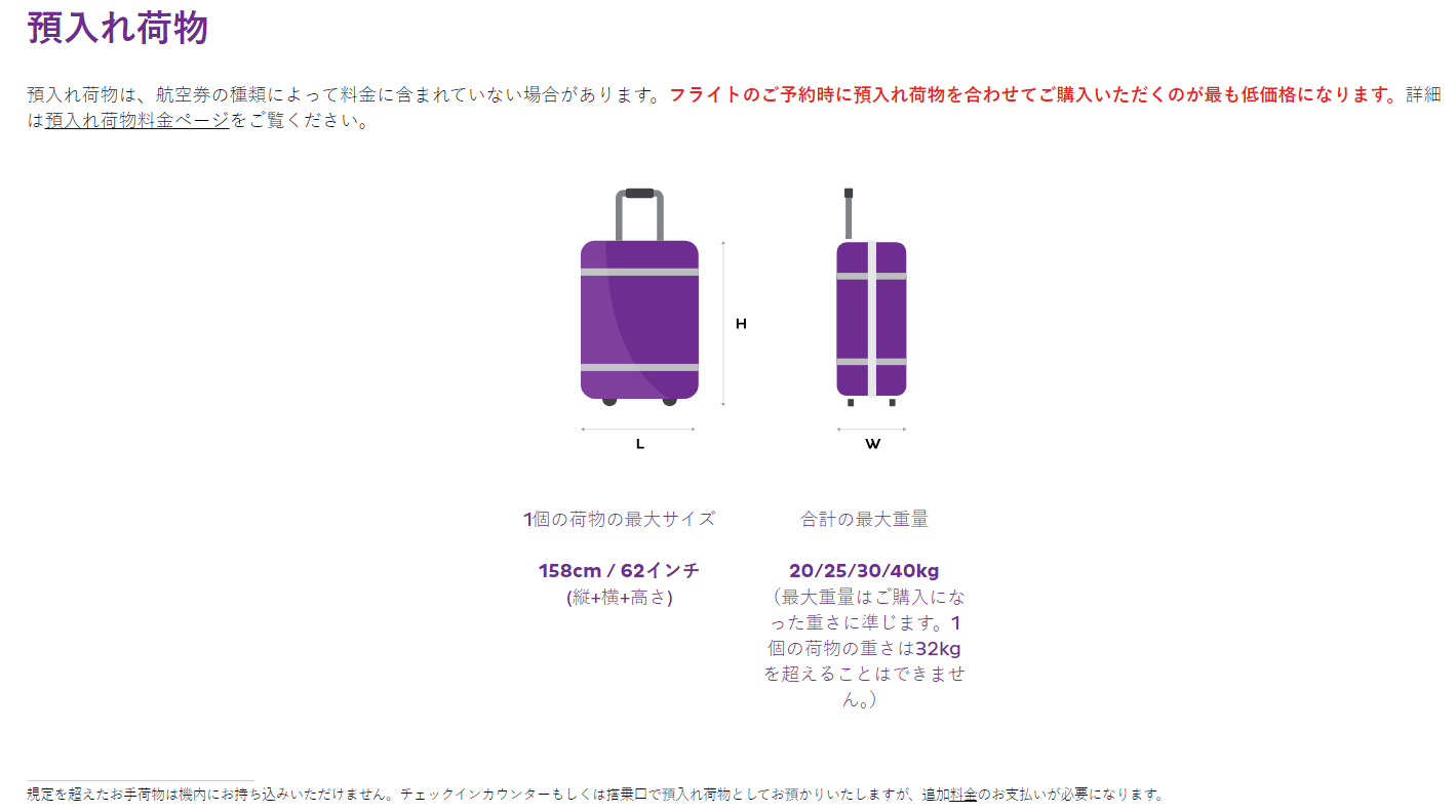 2024年5月7日以前にご予約になったお客様は、予約時の運賃タイプの規定が適用されます。詳細はこちらをご覧ください。預入れ荷物の許容量は、預入れ荷物をご購入になった日の規定が適用されます。
