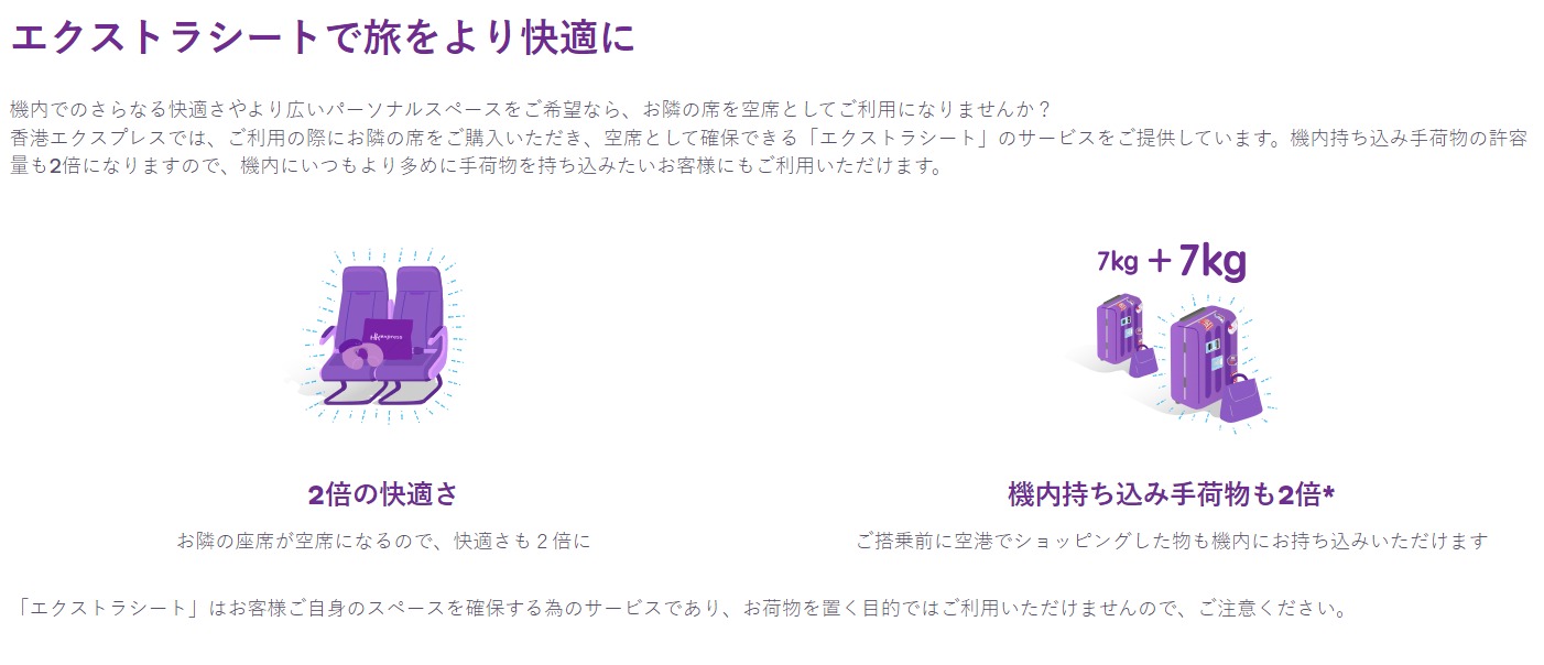 香港エクスプレスでは、ご利用の際にお隣の席をご購入いただき、空席として確保できる「エクストラシート」のサービスをご提供しています。機内持ち込み手荷物の許容量も2倍になりますので、機内にいつもより多めに手荷物を持ち込みたいお客様にもご利用いただけます。