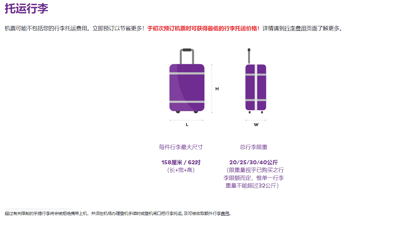 托运行李仅包含在随心飞和无忧飞的票价种类。 立即预订,节省最多!你亦可于初次预订、管理我的订位或网上预办登机手续时按照需求选择单独购买。 详情请到行李费用页面了解更多。详情请到行李费用页面了解更多。
