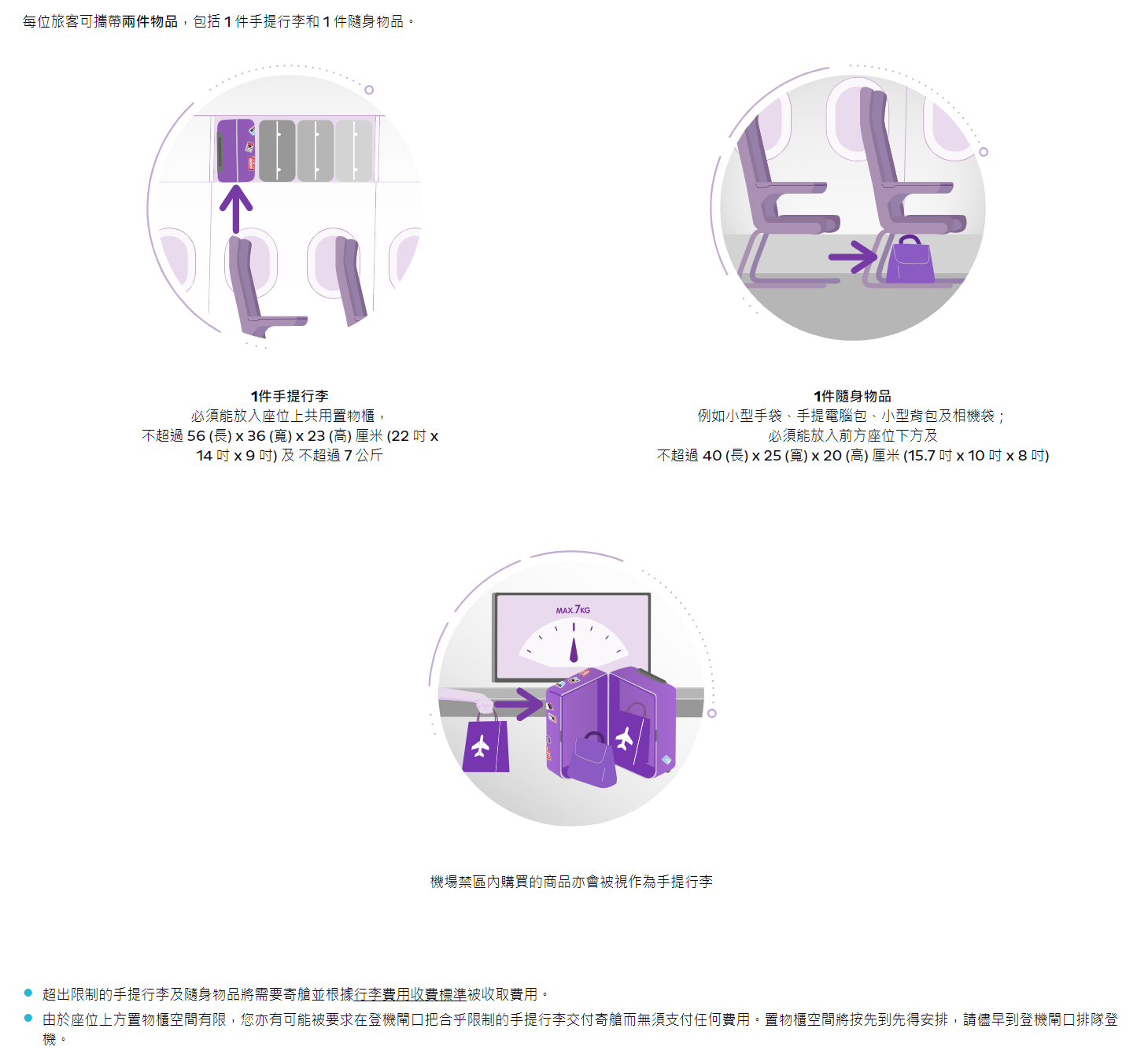 手提行李限額因票價種類而異,某些票價種類並不包括登機行李。詳情請參閱以下每位乘客的限額: