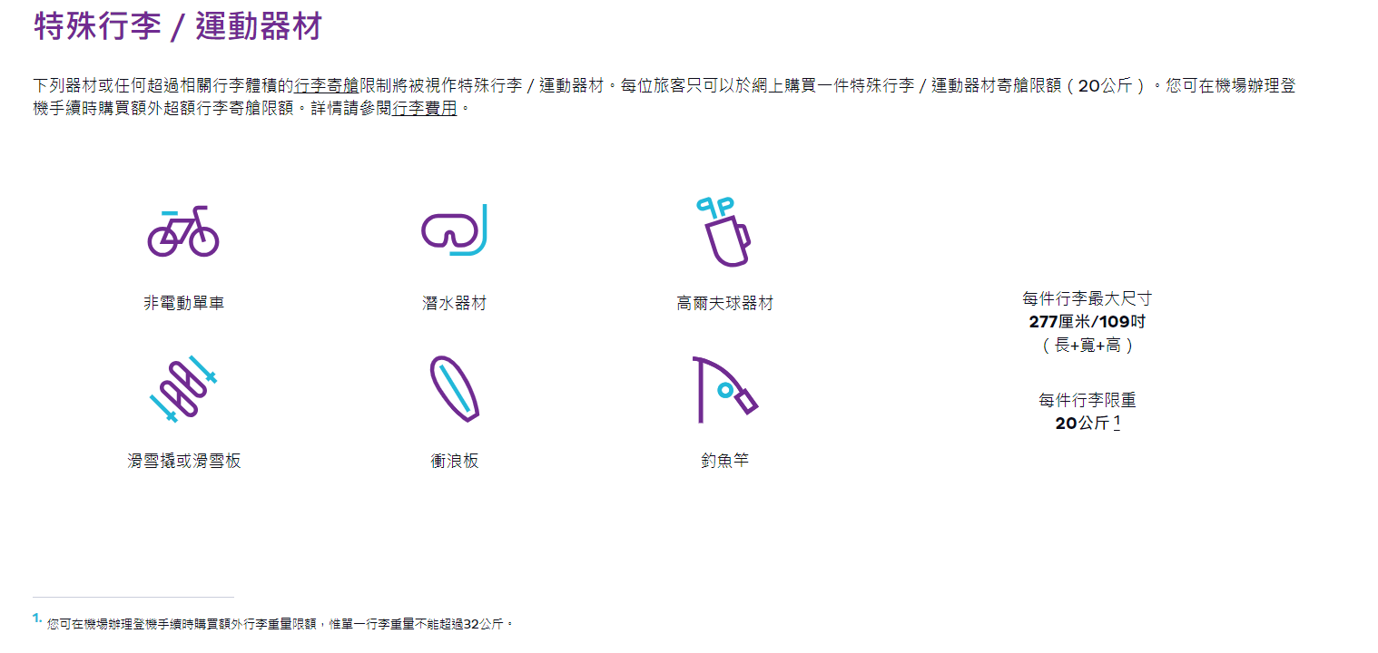登機行李的體積上限為 22 x 14 x 9寸。樂器會被計入登機行李限額內。