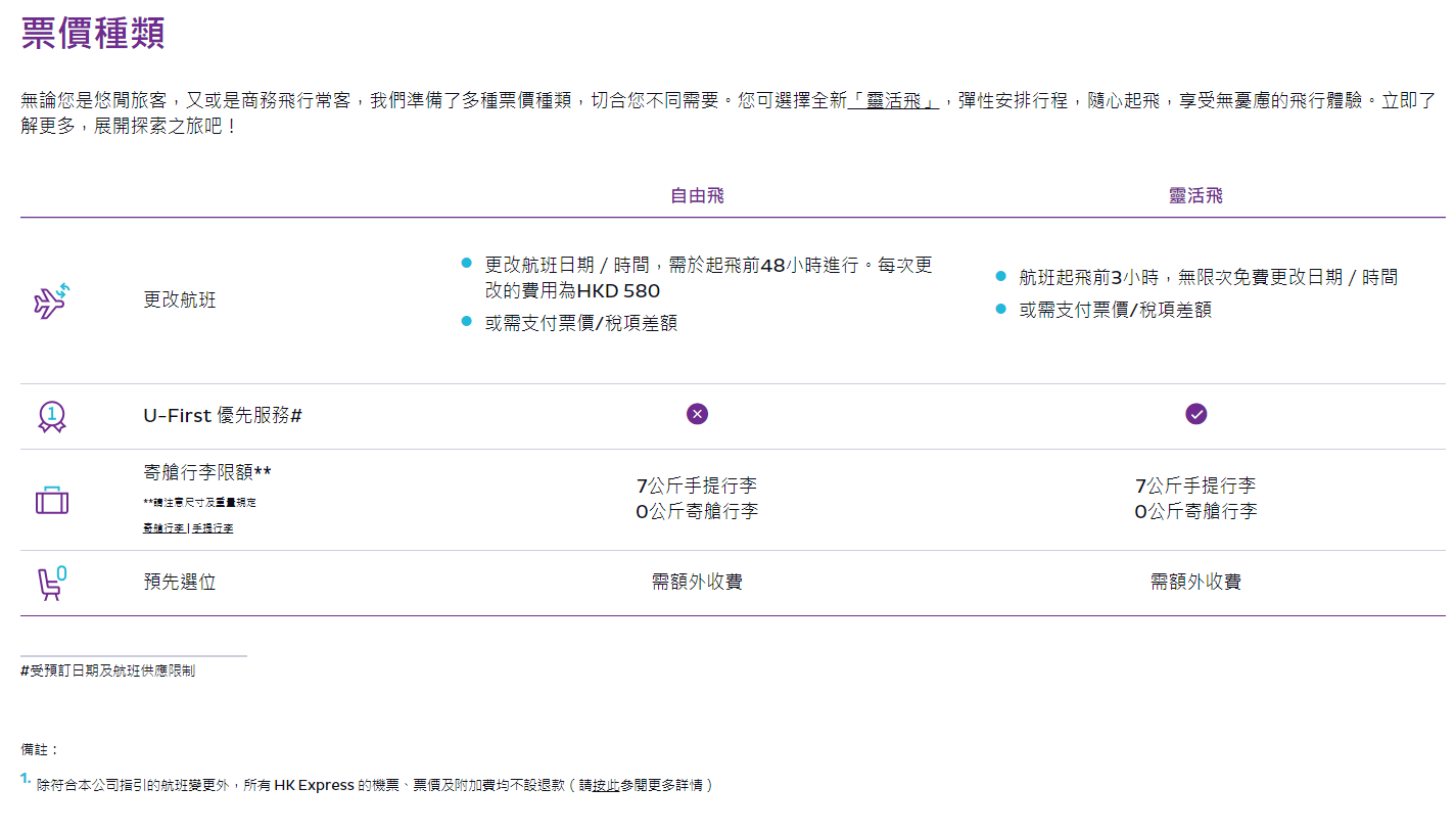 無論你是輕裝旅行的背包客、尋求經濟實惠票價的聰明旅行者,還是需要方便與朋友或家人一起出遊的一站式選擇,我們的票價種類都能夠切合你的需要。跟據你每次旅行的要求選擇適合的票價種類,並可添加需要的附加服務,圓滿你的旅行體驗。選擇香港快運航空,盡情享受絕佳的彈性和便利。立即預訂下一趟旅程!