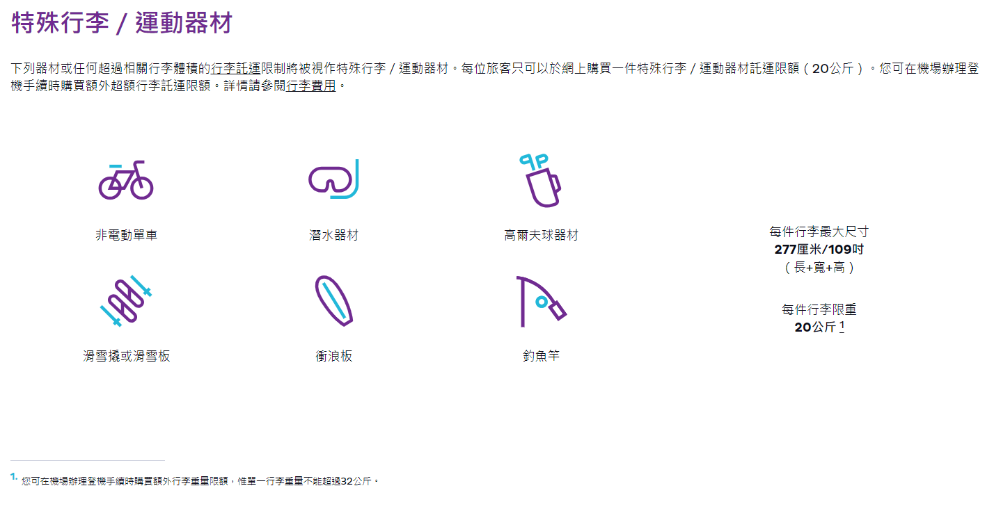 特殊行李/運動器材的限額不能用作普通寄艙行李使用。如需額外寄艙行李,請另作預訂。