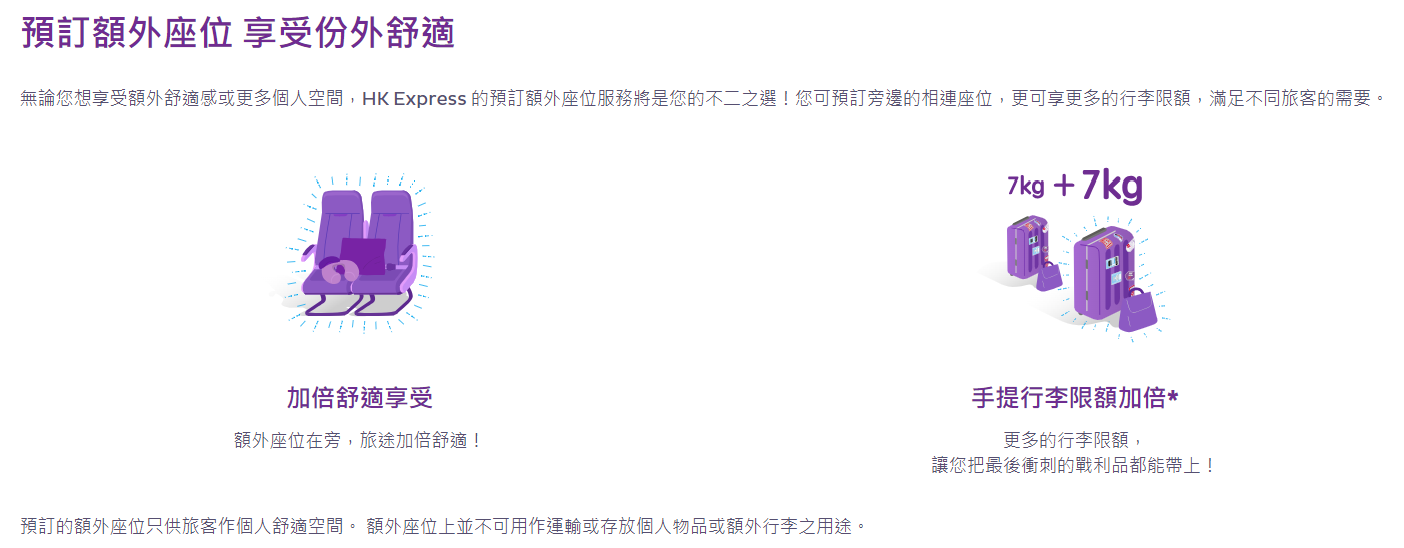 預訂的額外座位只供旅客作個人舒適空間。 額外座位上並不可用作運輸或存放個人物品或額外行李之用途。